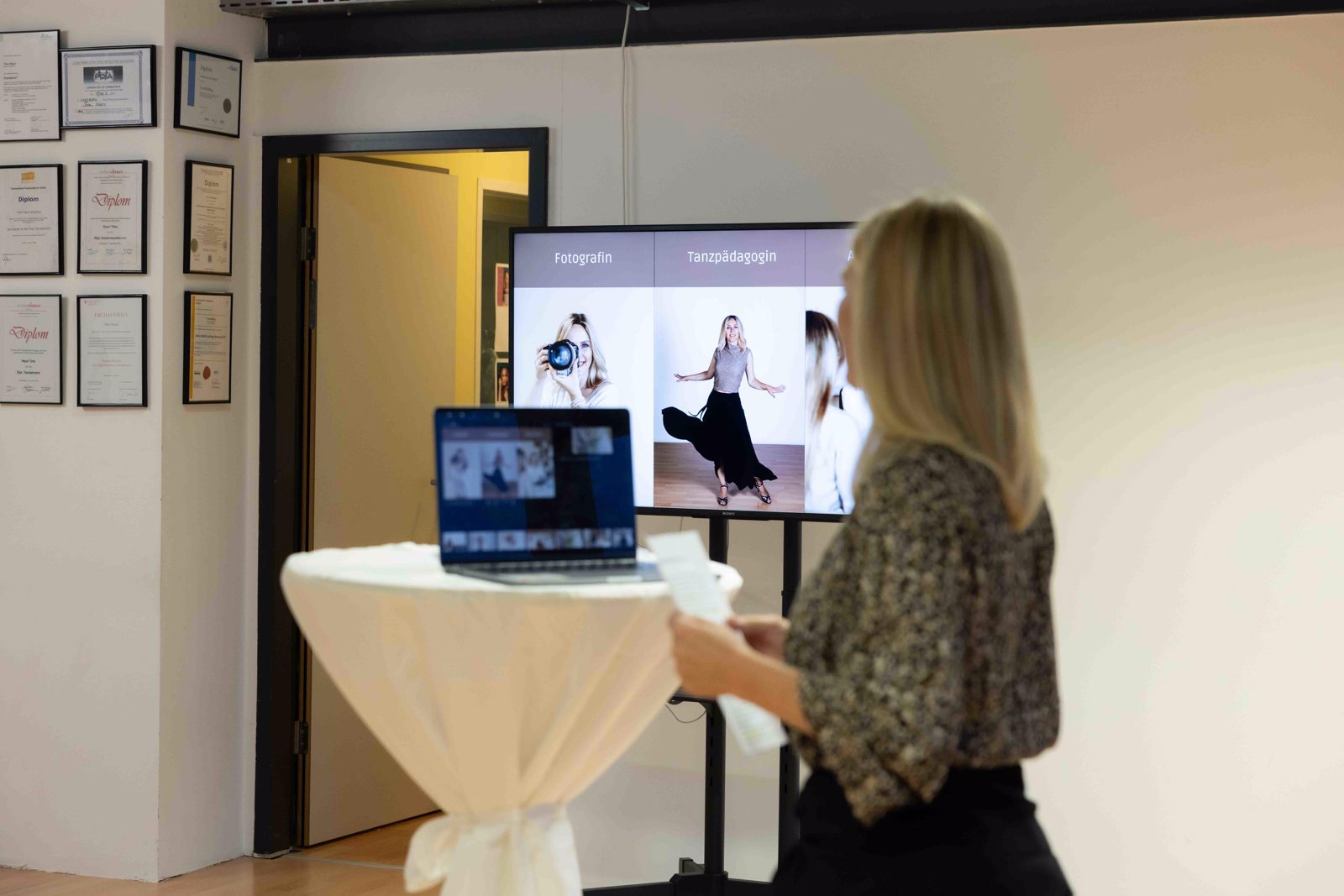 Tina Kissling bewegt sich in ihrem Alltag zwischen zwei kreativen Welten, die immer wieder aufeinandertreffen. Das spüren wir vor allem in ihrem Studio, das zugleich Tanz- und Fotostudio ist. In dem Raum, direkt neben dem Büro von Jeany, wird Tina kreativ: Paartanz und Einzeltanz finden hier genauso Platz wie Fotoshootings von Paaren, Gruppen oder auch Tänzer:innen.