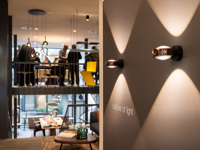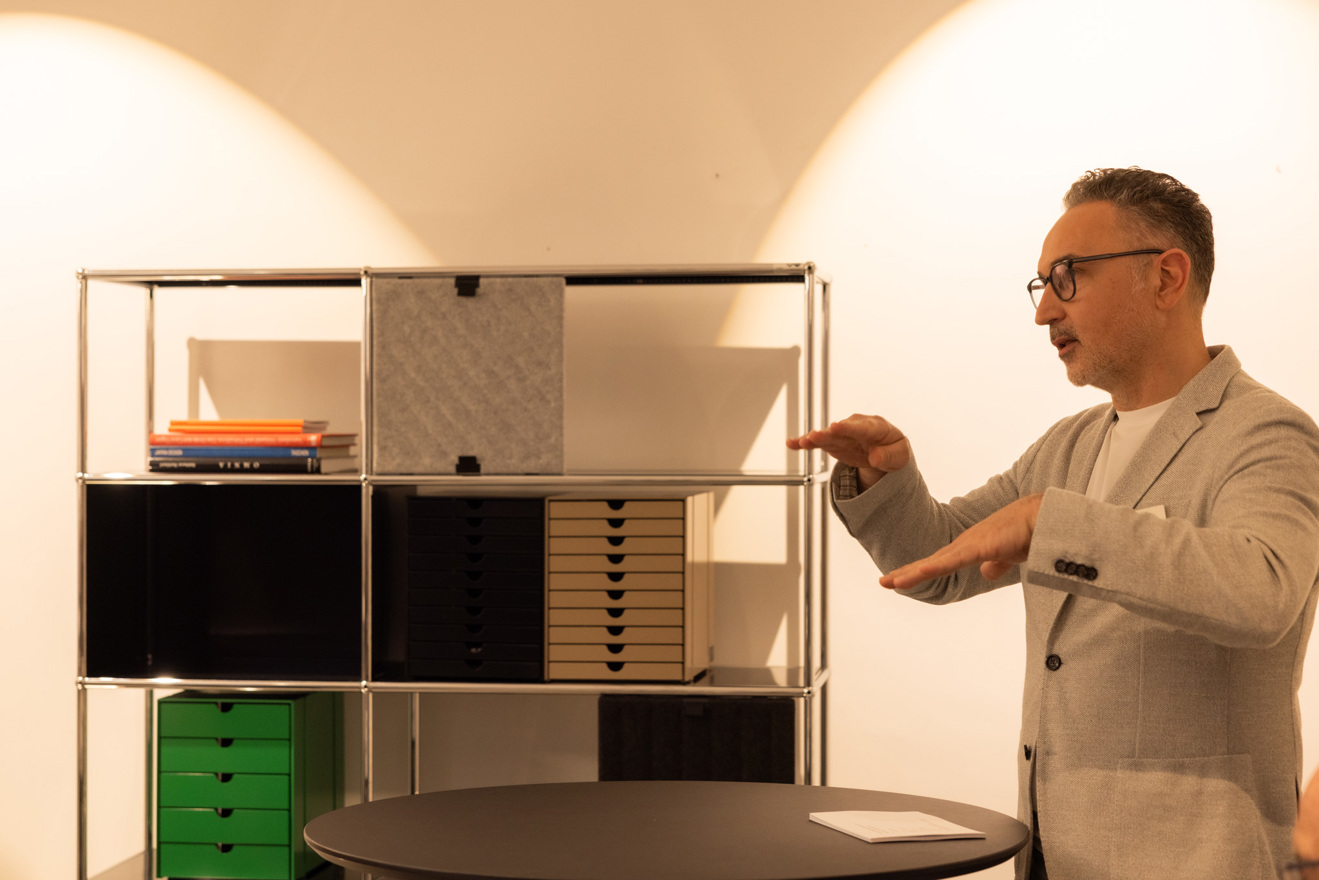 Über eine weitere Halbetage und durch den unterirdischen Tunnel geht es dann zu Davor Martic in die Welt der Büros. hier treffen wir natürlich auch auf die Marke für moderne Büros: USM. Neue Softpanels sorgen für neue Gestaltungsmöglichkeiten und raumakustische Vorteile, erzählt Davor.