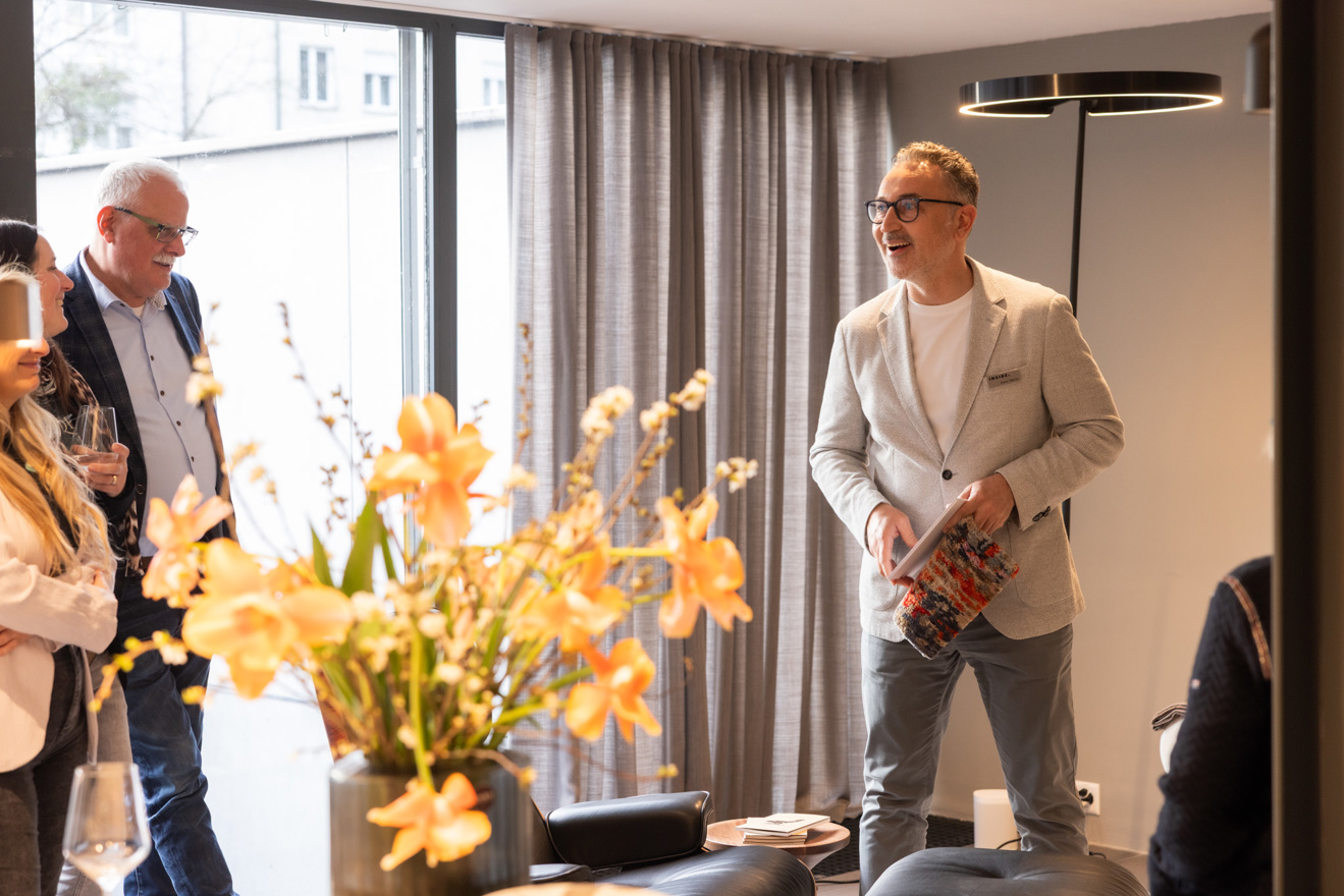 Ein Donnerstagabend an der Baslerstrasse: Wir treffen uns zum Inside im INSIDE und werfen einen Blick in den Showroom, der sich verschachtelt auf den Etagen hinter den Schaufensterkästen der Nummer 19 verbirgt. Für einen Abend dreht sich hier alles um Designmöbel, um Raumtextilien und Licht. Geschäftsführer Davor Martic und sein Team stellen sich vor und zeigen uns die Welt hinter dem Entwerfen von Raumwelten. Sie geben uns einen Einblick in den Showroom und die Arbeit dahinter.